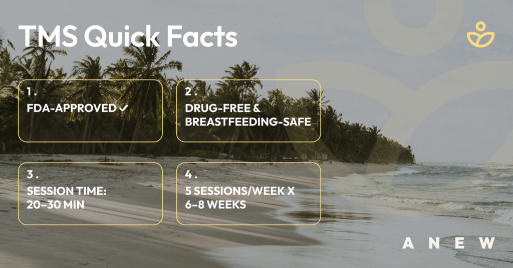 TMS at Anew Therapy is delivered by trained clinicians in a comfortable setting tailored for moms. You don’t need to “wait it out” or struggle in silence, TMS can be a turning point in your recovery.Learn more about TMS therapy and insurance coverage here.
