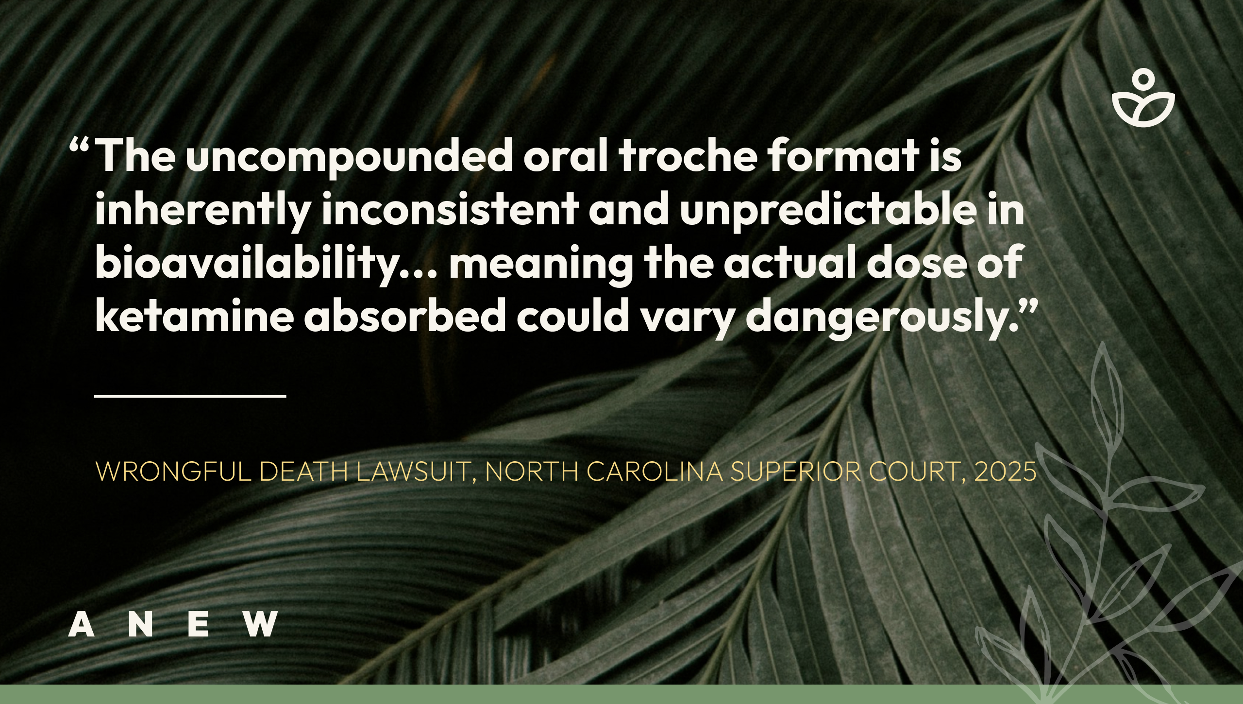 According to the lawsuit, ketamine troches (lozenges) were shipped to Phillip without adequate medical oversight, despite known medical risk factors including hypertension, tachycardia, and missed clinical appointments. The complaint alleges that the product shipped to him was a compounded formulation not approved by the FDA, and that the service failed to monitor his use or respond appropriately when red flags arose.