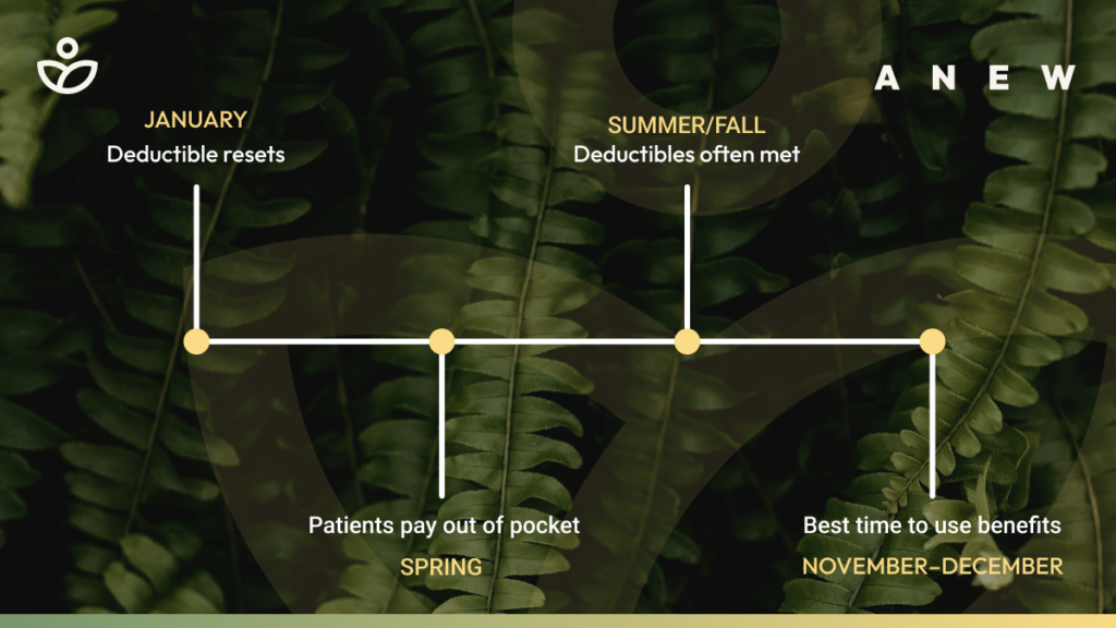 Understanding why insurance benefit plans reset annually and when your policy resets can help you make informed decisions about your treatment plans. Consistently reviewing your benefits and the status of your deductible will keep you on top of mental health benefit maximization, especially towards the end of the year. Planned accordingly, you won’t have to wait until the end of the year if you don’t want to!