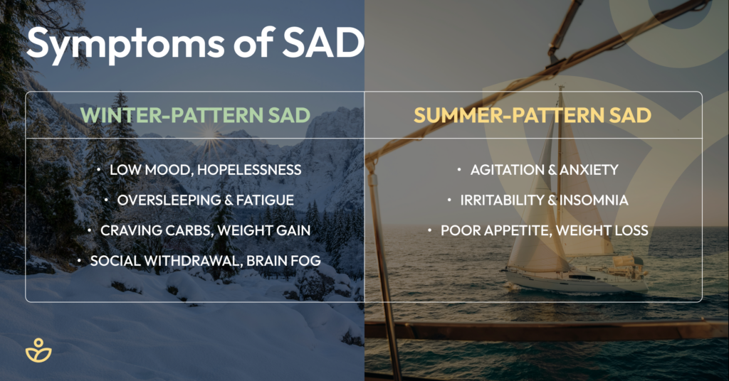 Summer-Pattern SAD (Less Common): Agitation, anxiety, irritability, insomnia, decreased appetite, and potential weight loss